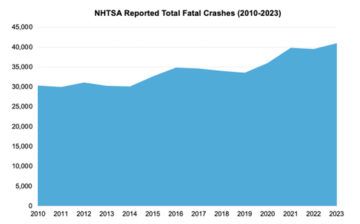 Each year, roughly 34,000 people are killed in traffic crashes on U.S. roads. In 2023 alone, that number climbed to more than 40,000 fatalities. These terrible accidents can be attributable to a number of human factors including speeding, distraction, impairment, or age. While new and improved safety features are continually rolled out with new vehicle models, mortality and injury rates have remained, unfortunately, stubbornly consistent. In 2010, there were 25% fewer people involved in fatal car crashes than 2023. This troubling trend shows that technology improvements cannot fix the fact that there is a person–an increasingly distracted person–behind the wheel.
