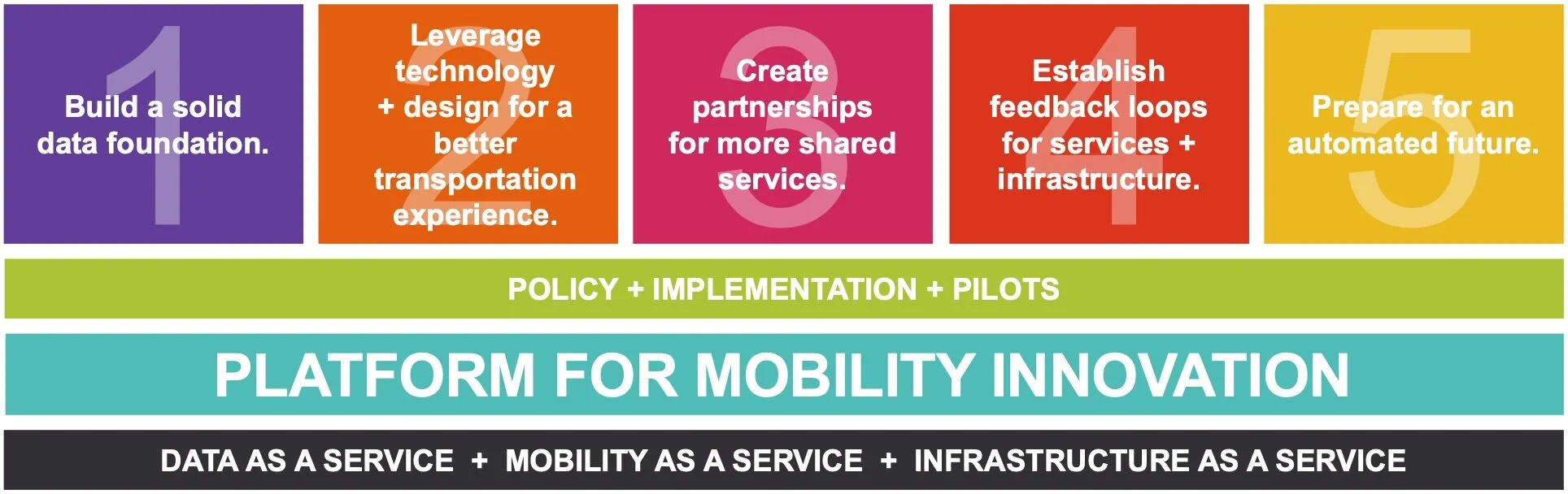 Building on the existing innovative work of the department, the strategy defines public policy recommendations ranging from topics such as data sharing and land use; an action plan for next steps to transform the department into a 21st Century mobility manager; and outlines a series of pilot initiatives to demonstrate and test advanced technologies, from smart city sensors and smartphones, to bikeshare and automated vehicles.